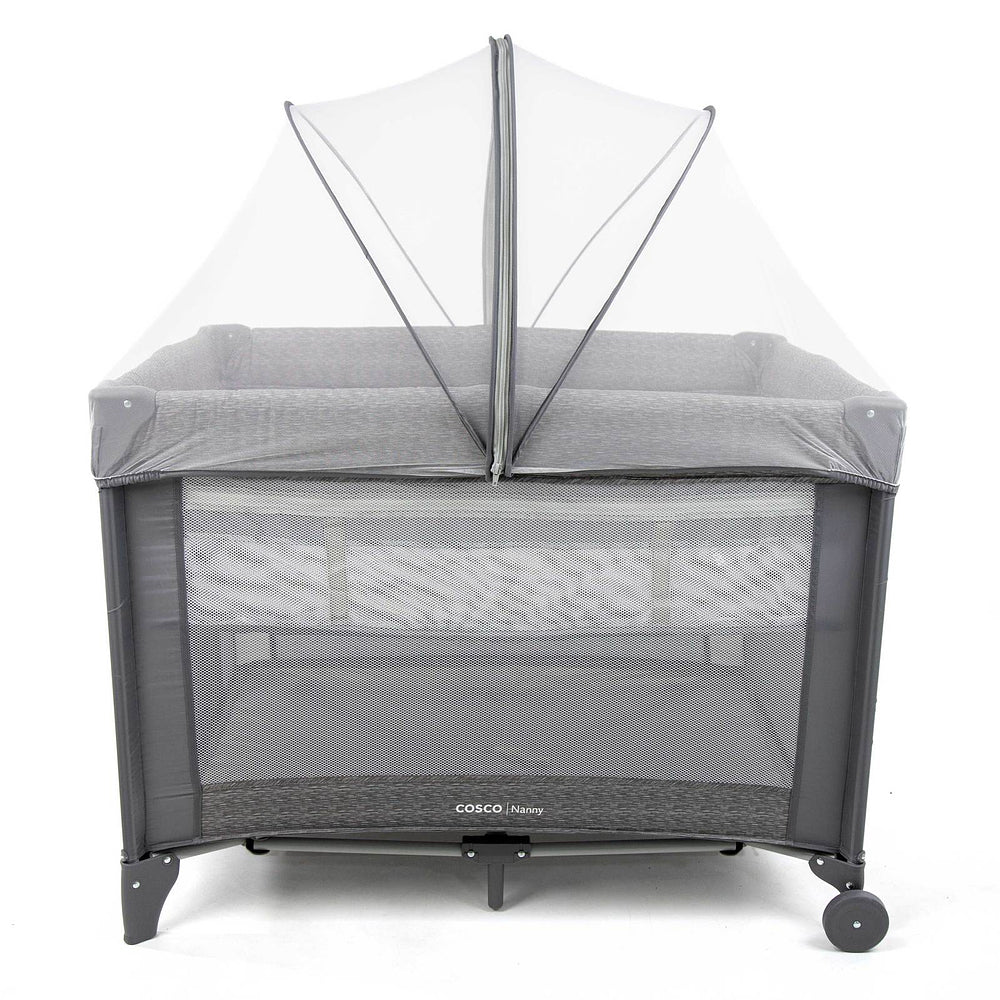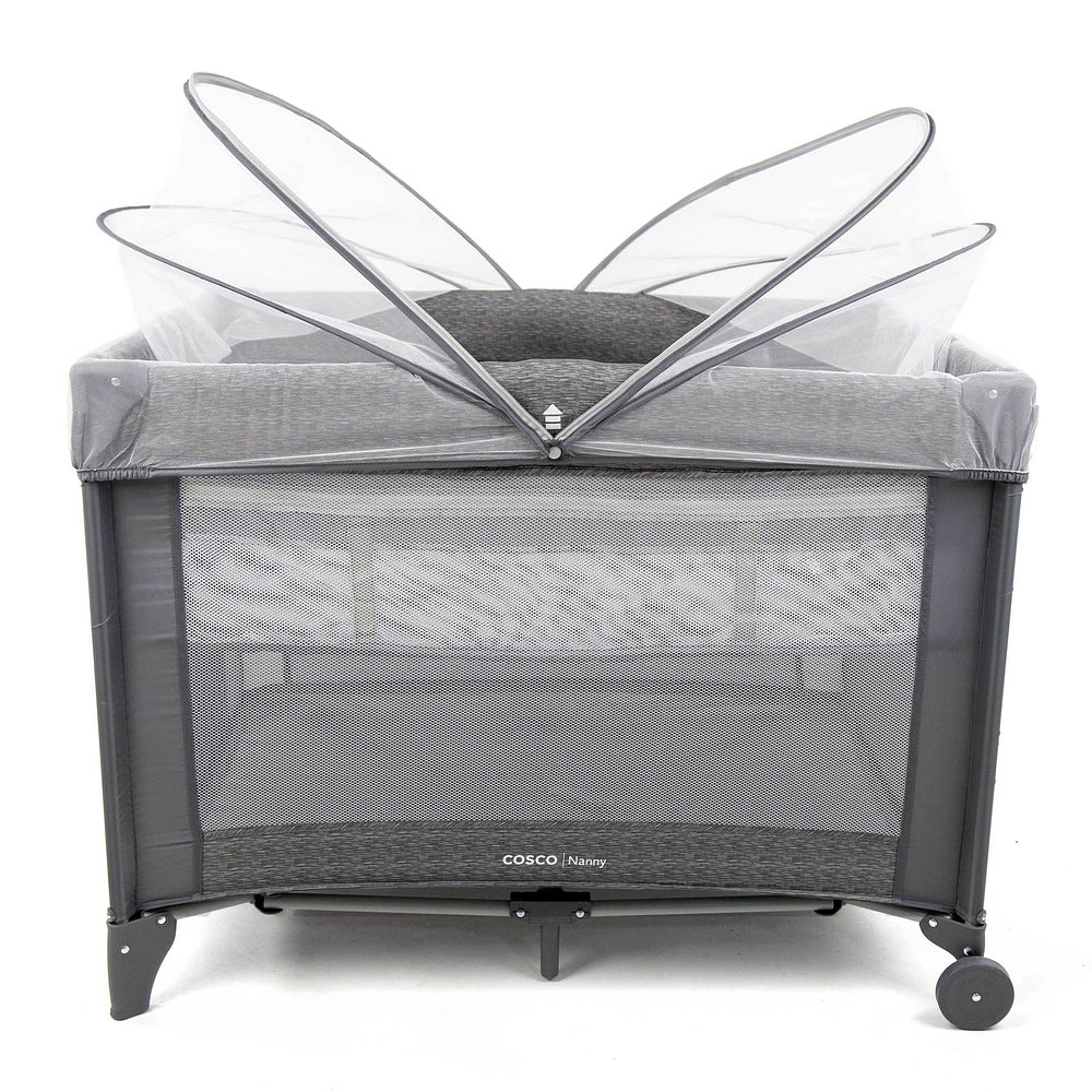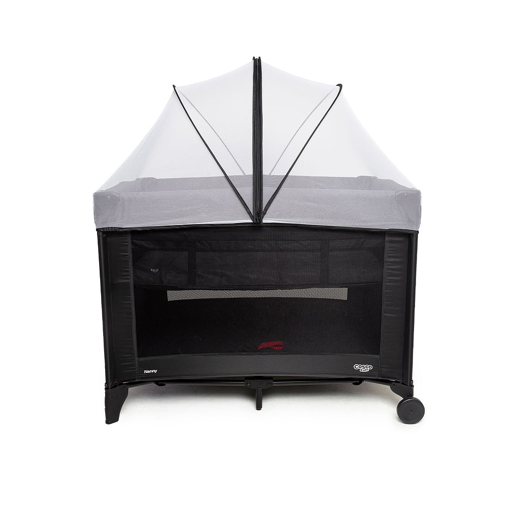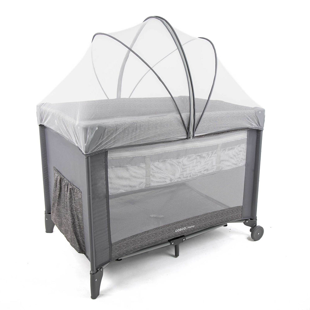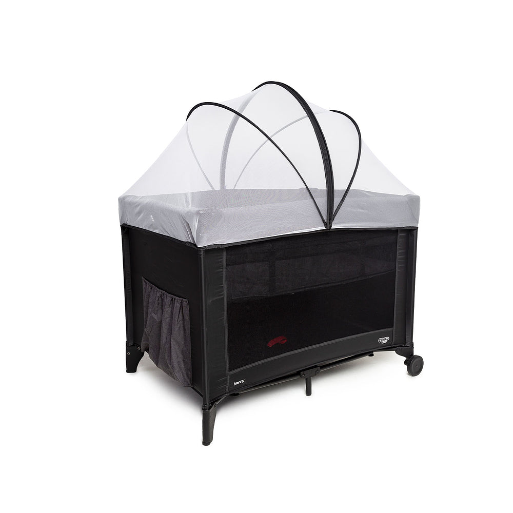 Berço com 2 alturas, tela respirável nas laterais, mosquiteiro elevado com abertura em zíper para fácil acesso, rodas, bolso porta-objetos e bolsa de transporte.