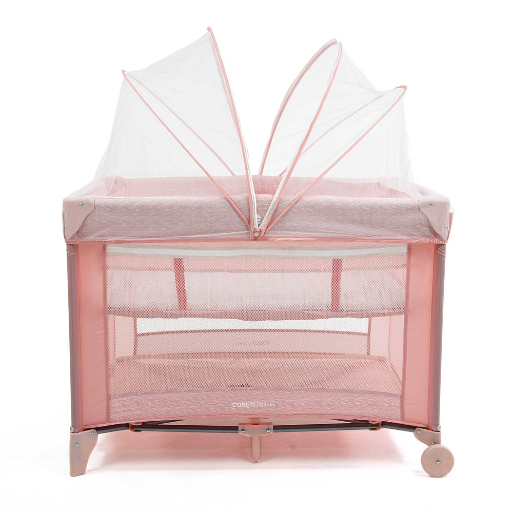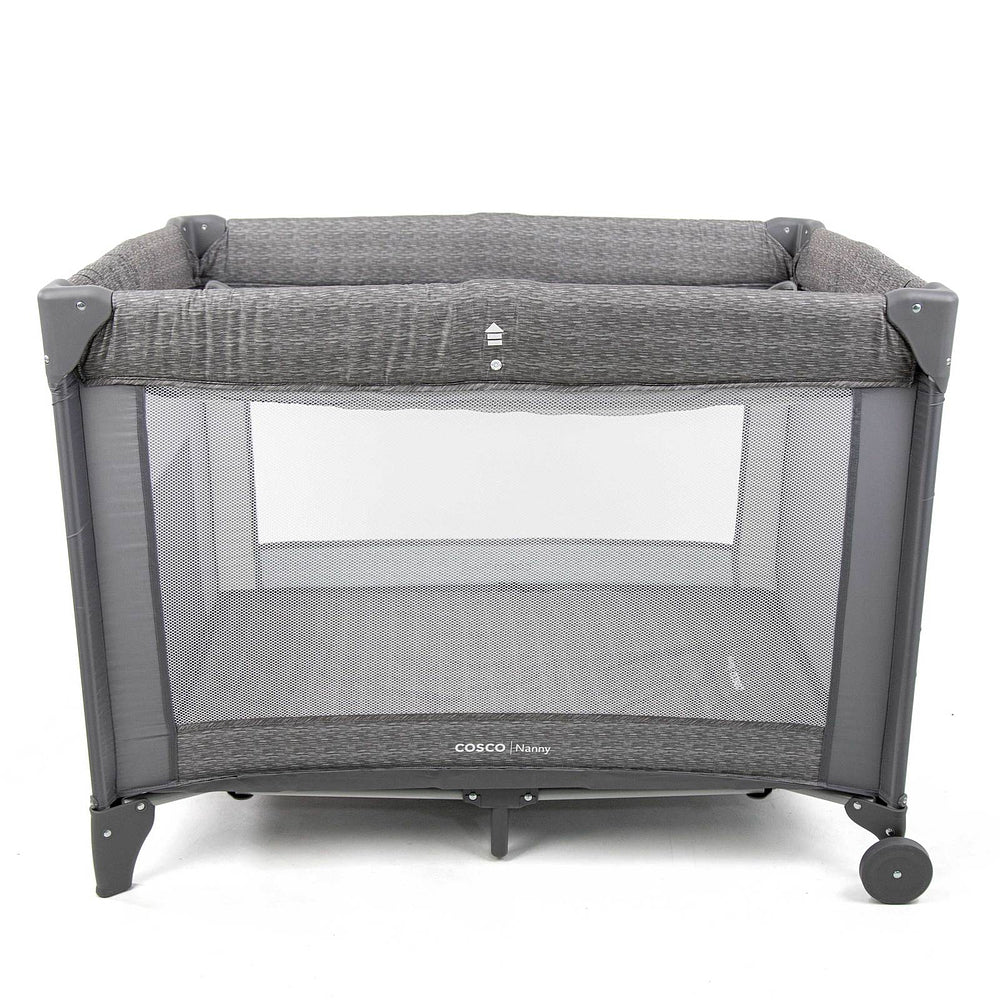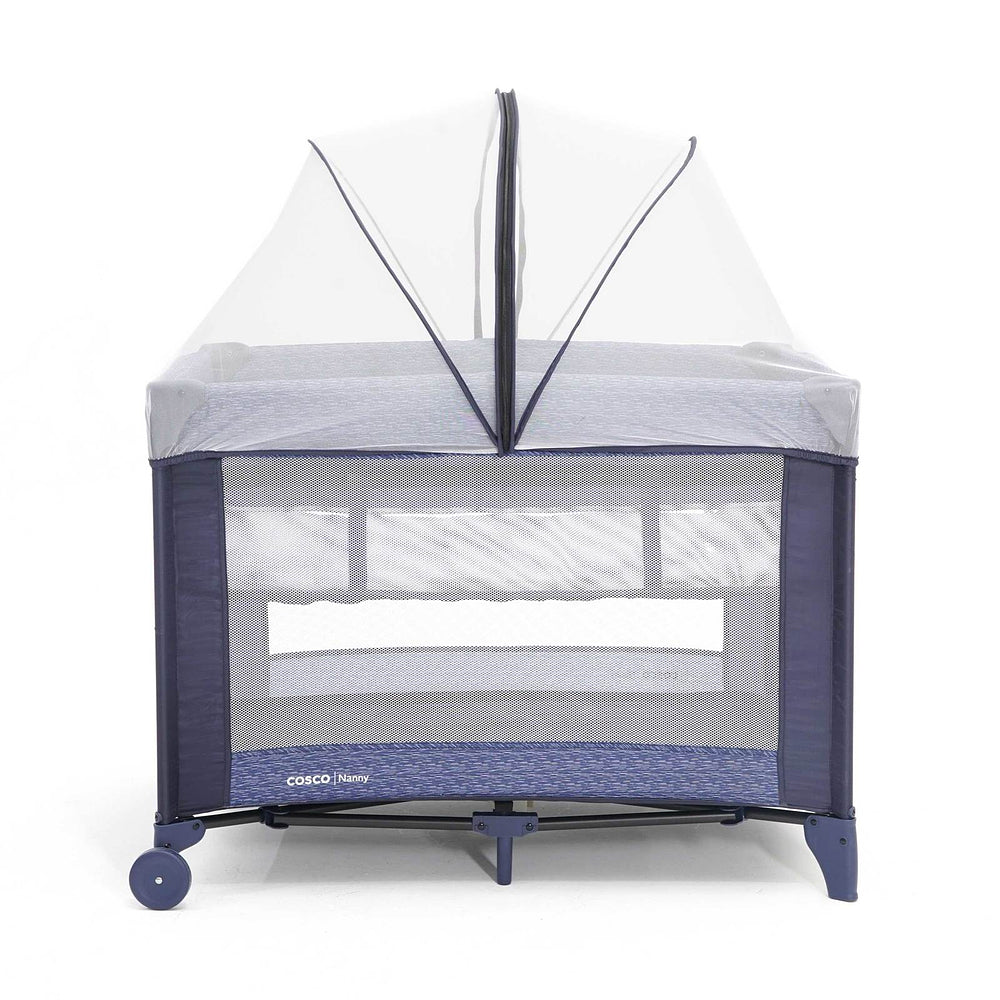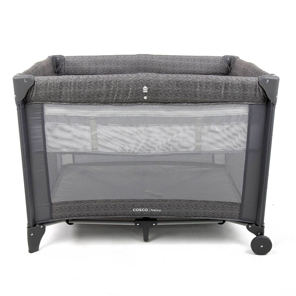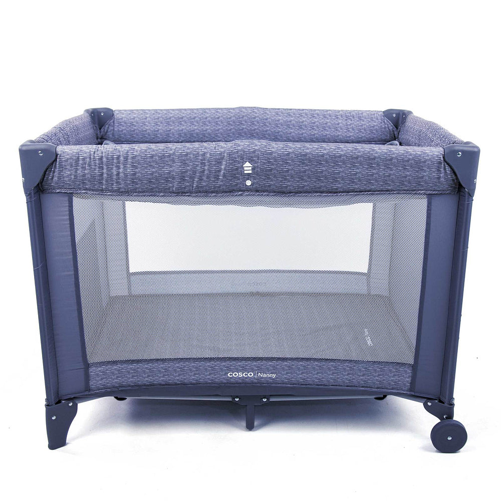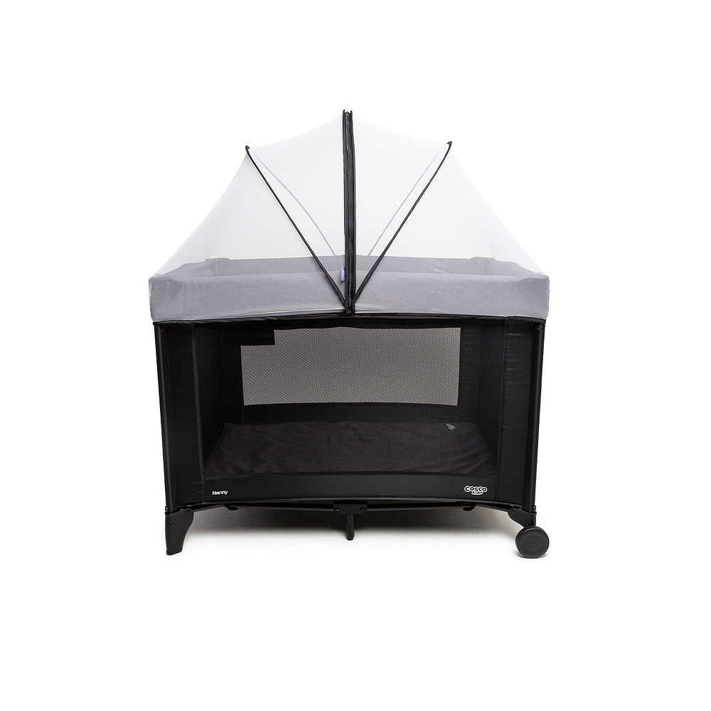 Berço com 2 alturas, tela respirável nas laterais, mosquiteiro elevado com abertura em zíper para fácil acesso, rodas, bolso porta-objetos e bolsa de transporte.