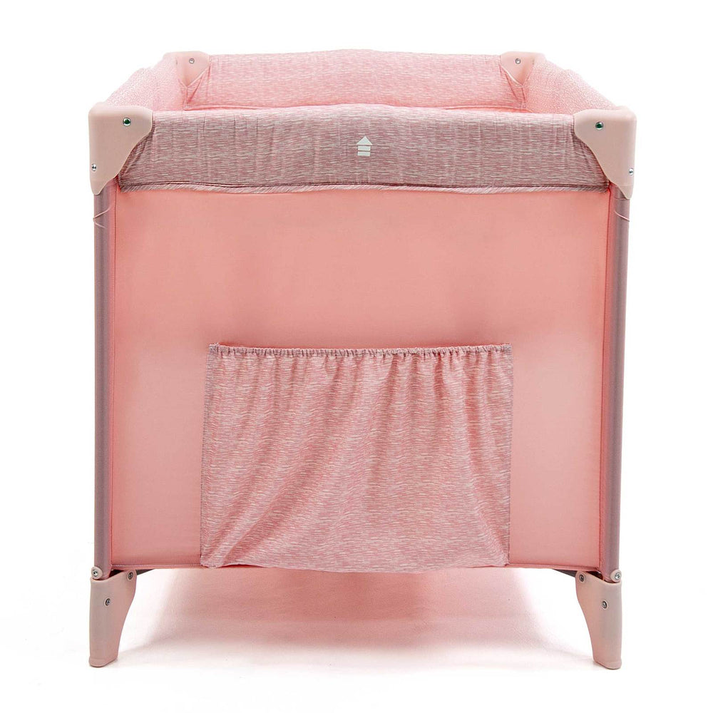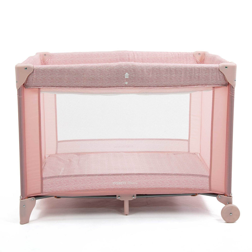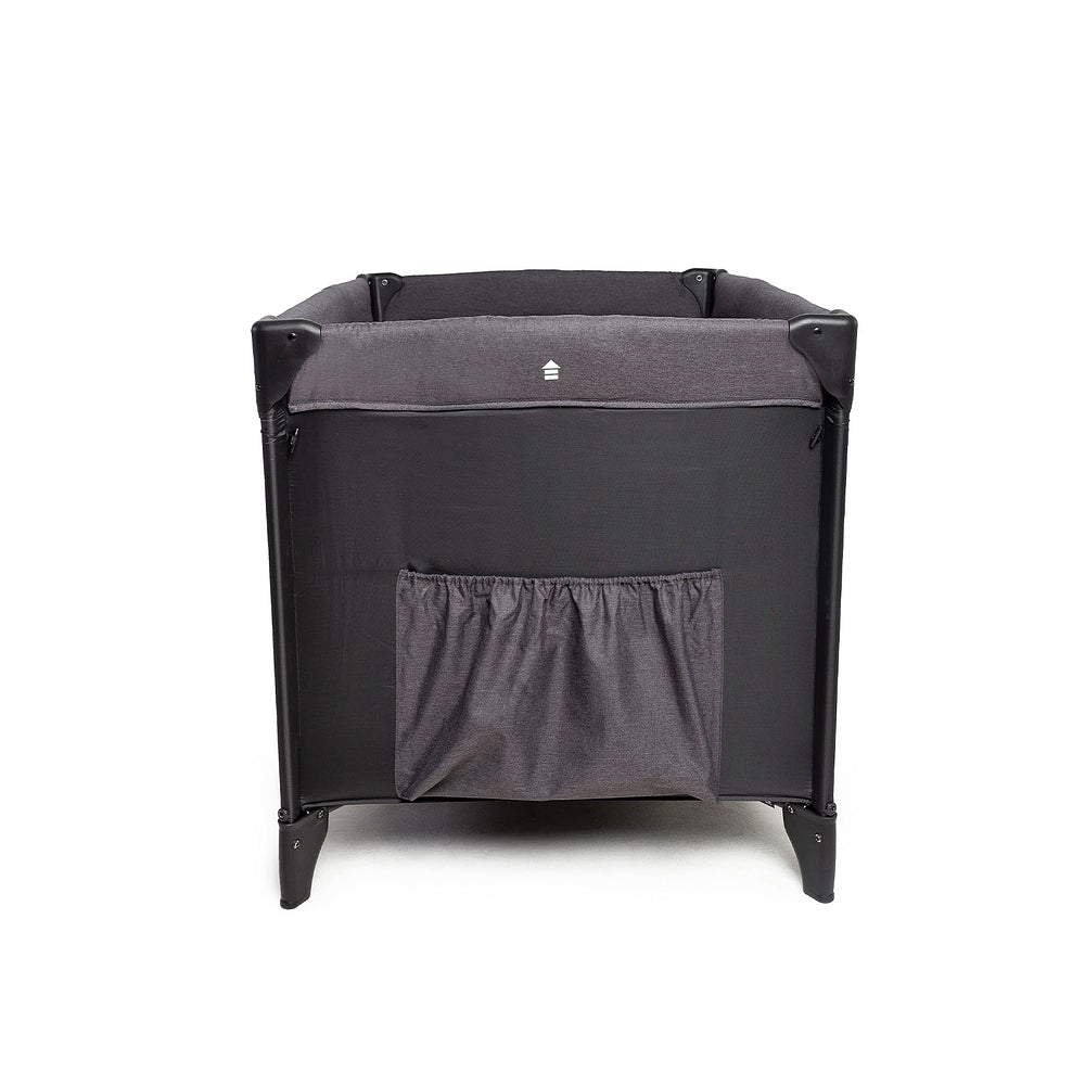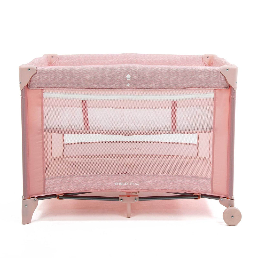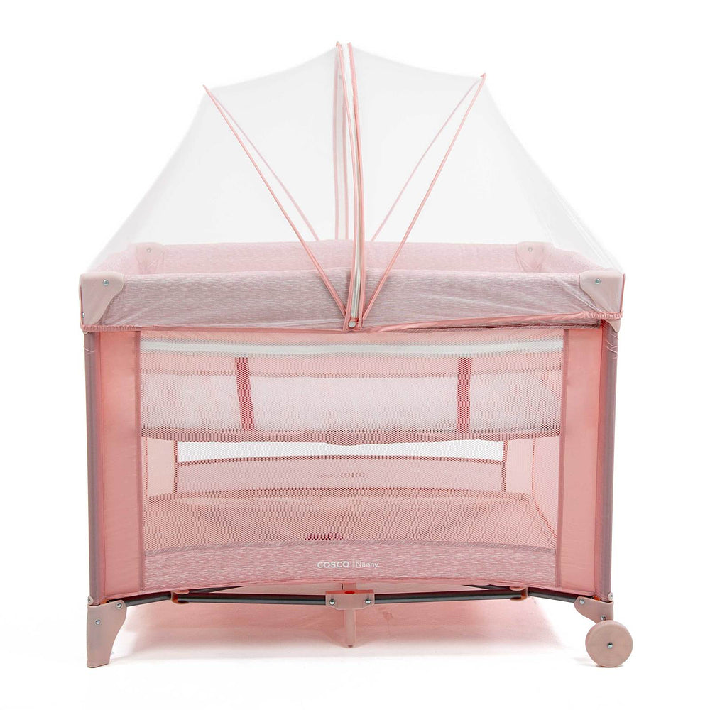 Berço com 2 alturas, tela respirável nas laterais, mosquiteiro elevado com abertura em zíper para fácil acesso, rodas, bolso porta-objetos e bolsa de transporte.
