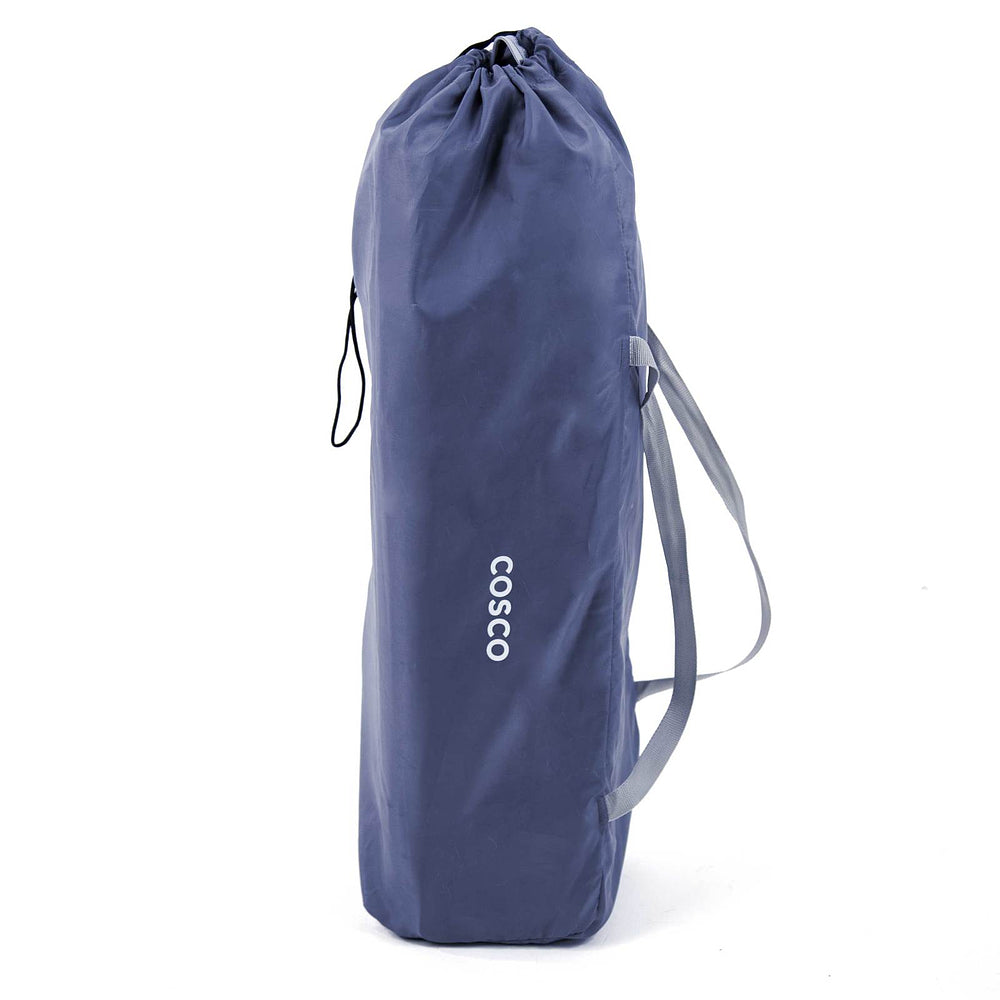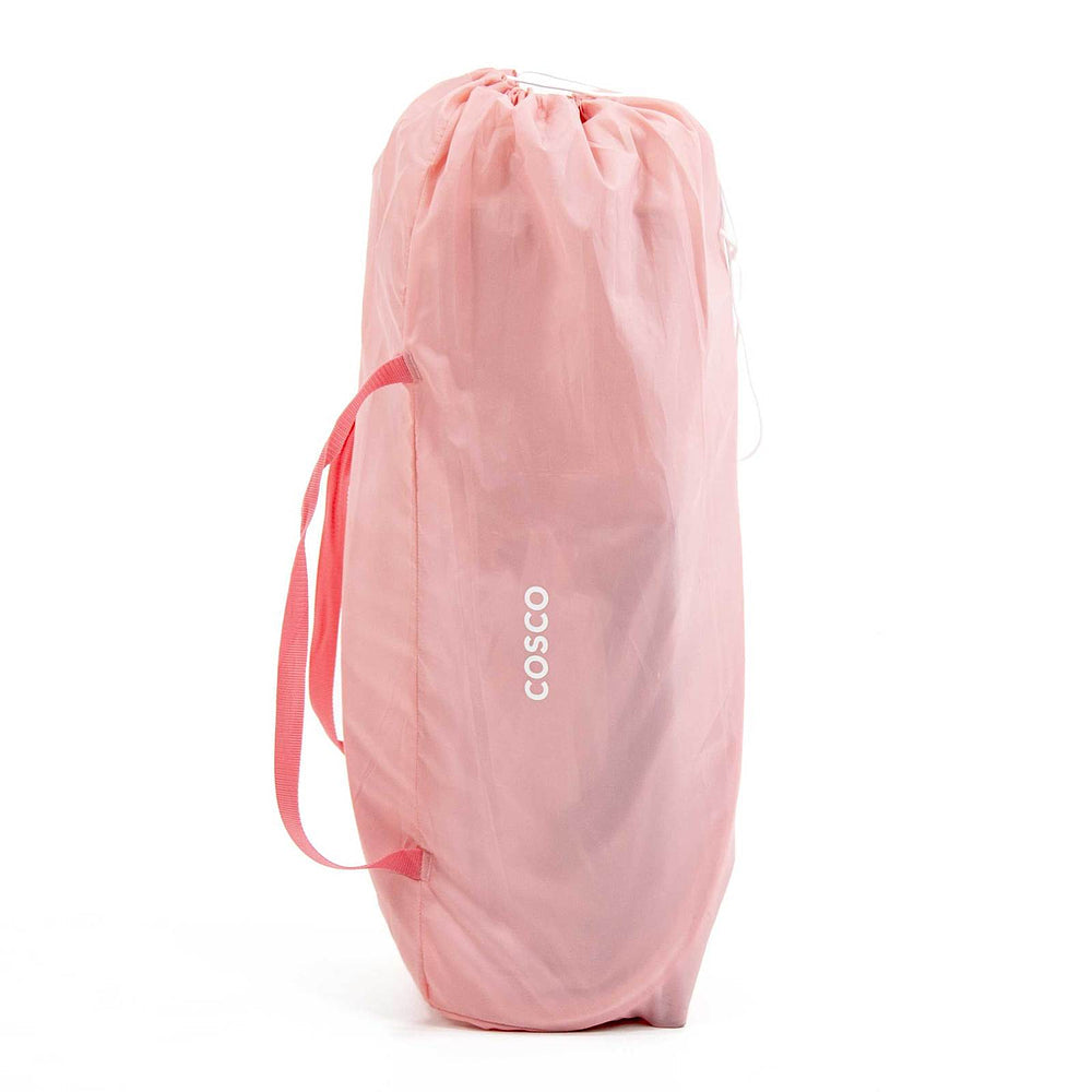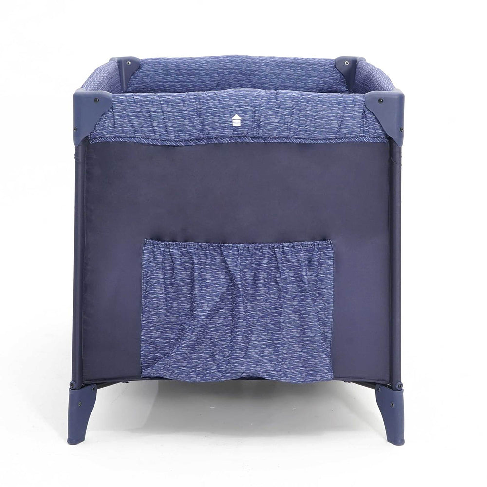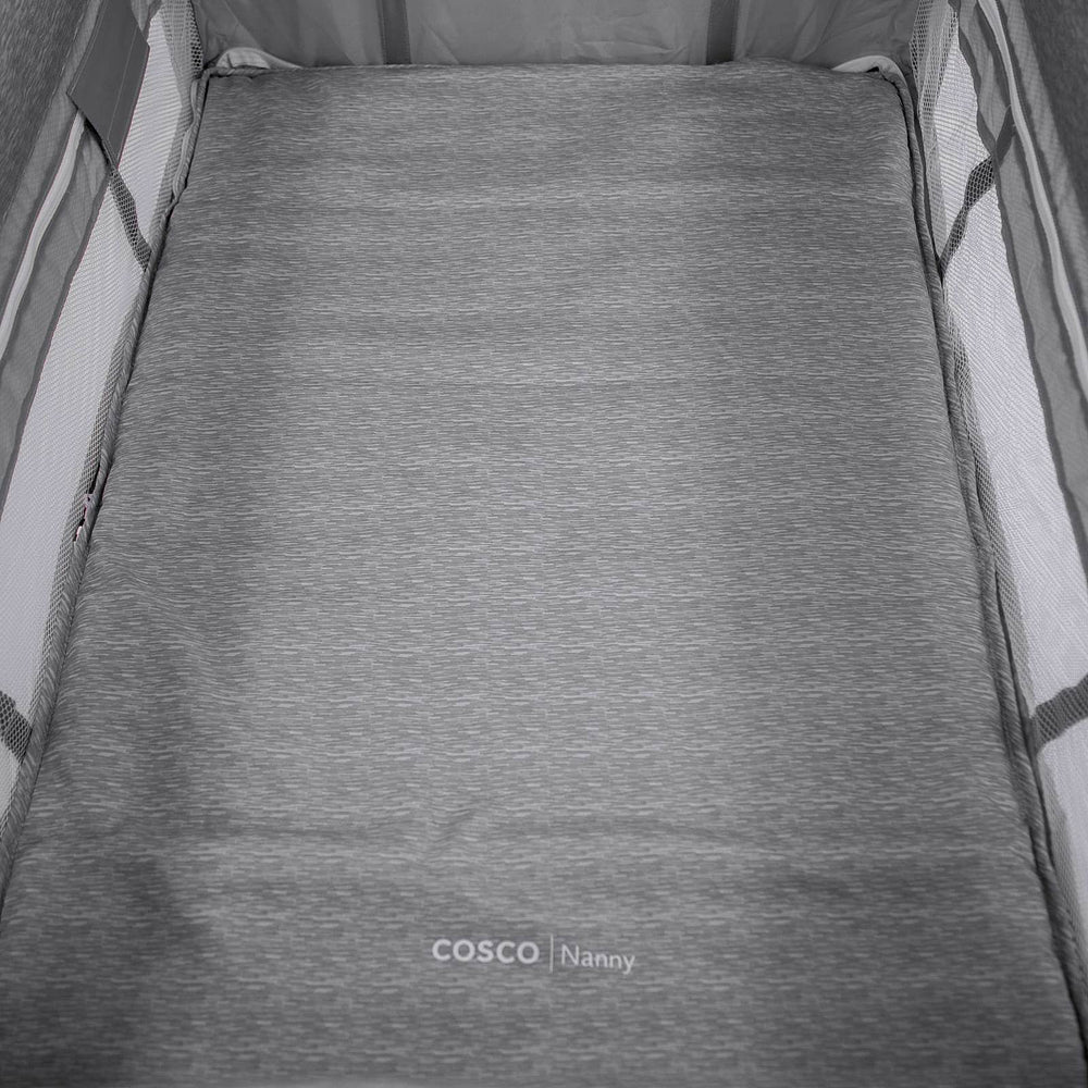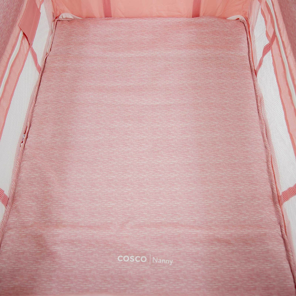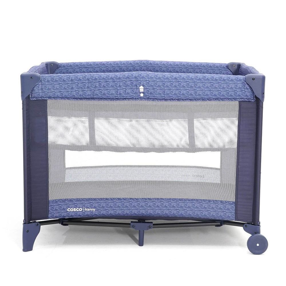 Berço com 2 alturas, tela respirável nas laterais, mosquiteiro elevado com abertura em zíper para fácil acesso, rodas, bolso porta-objetos e bolsa de transporte.