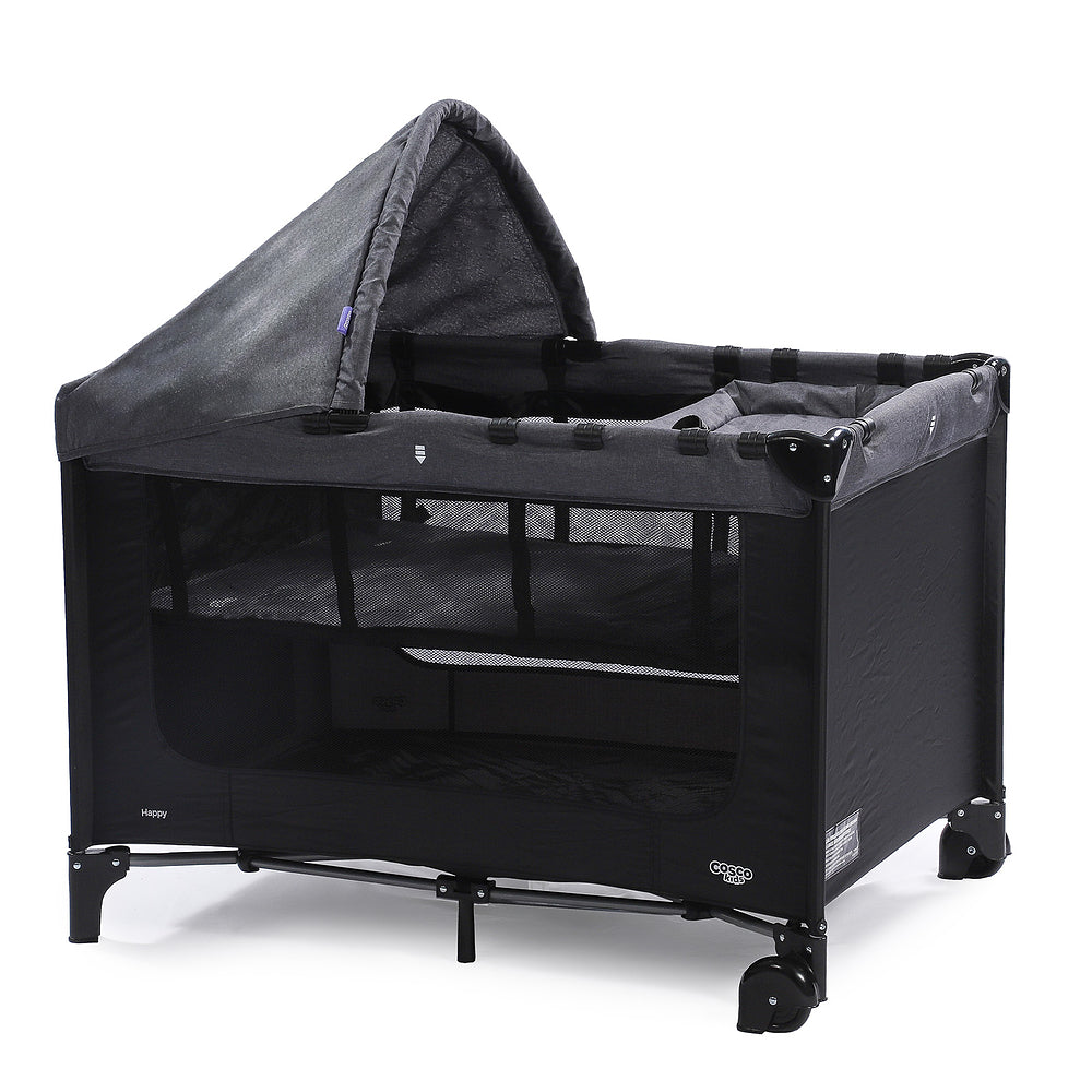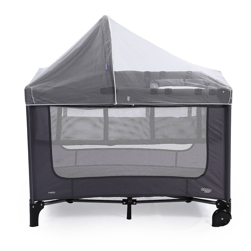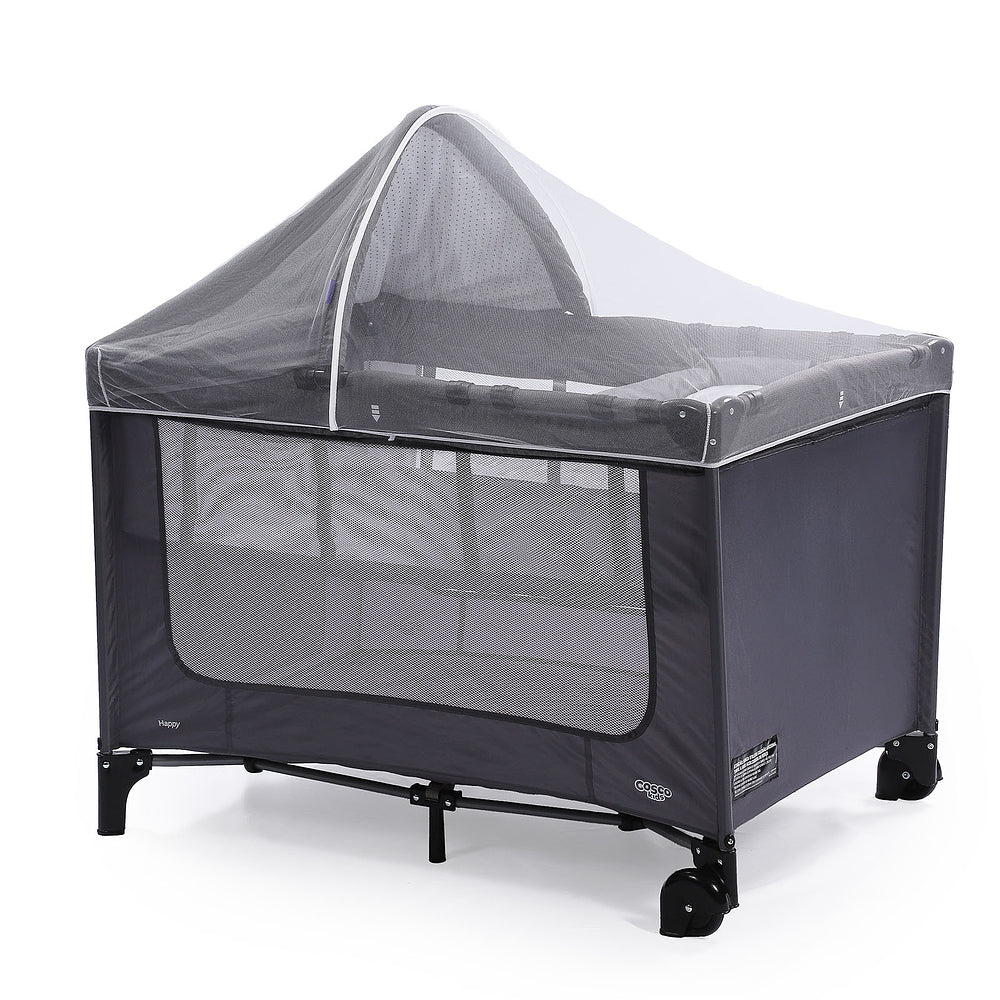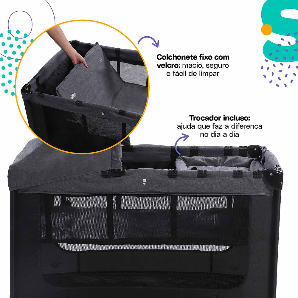 Com duas alturas, é prático e compacto. Fácil para carregar: bolsa de transporte com alça. Completo com trocador, colchonete, capota e mosquiteiro.