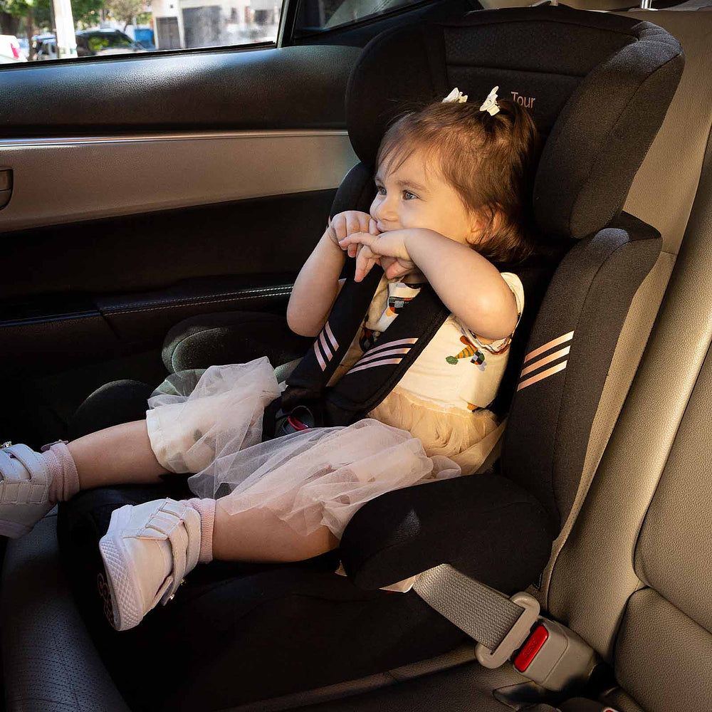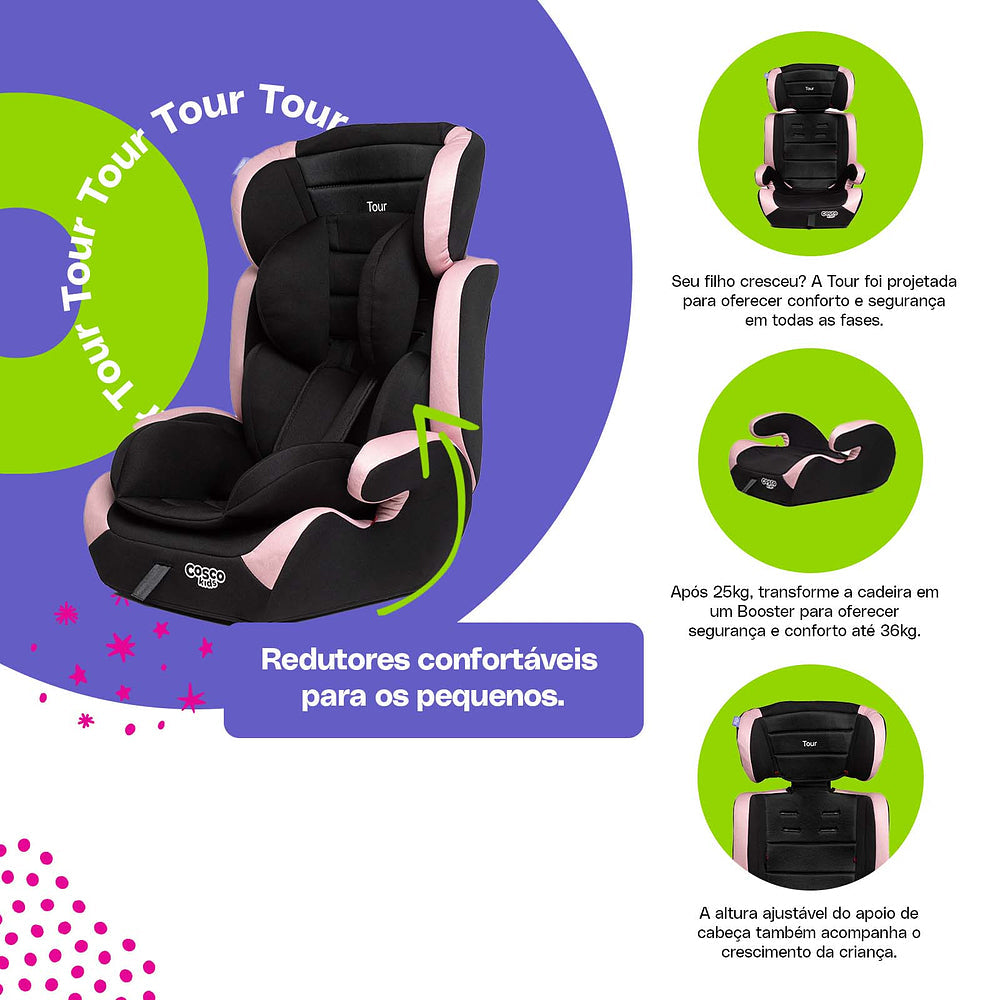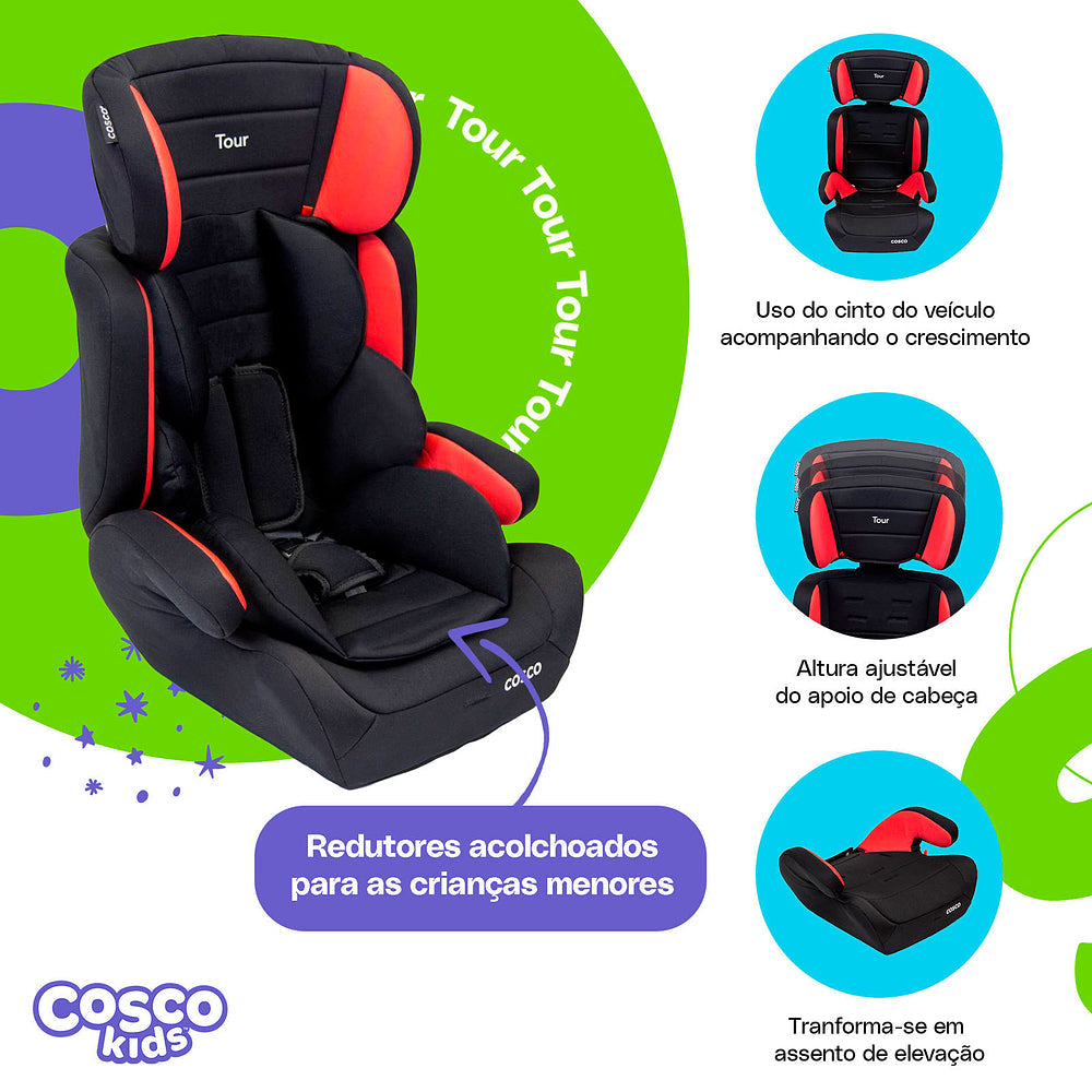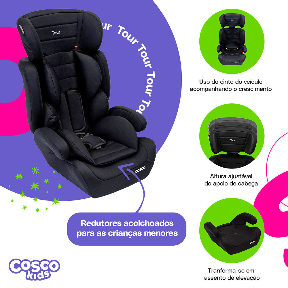 Cadeirinha que acompanha o crescimento da criança, redutores reposicionáveis para os menores, apoio de cabeça ajustável em altura e assento de elevação para os maiores. Capa da cadeira lavável.
